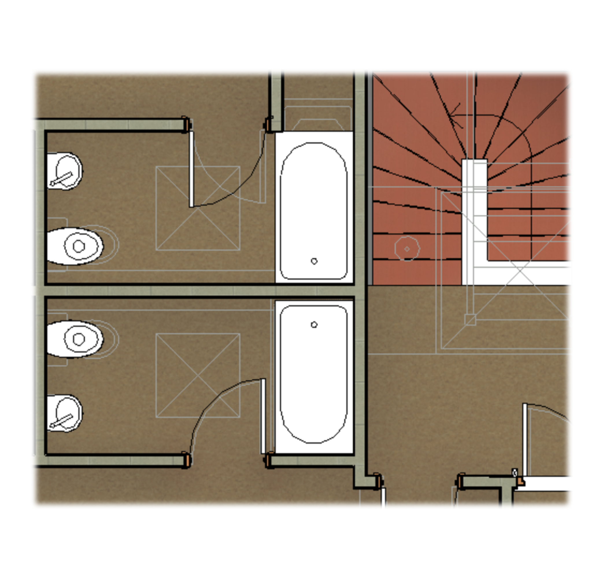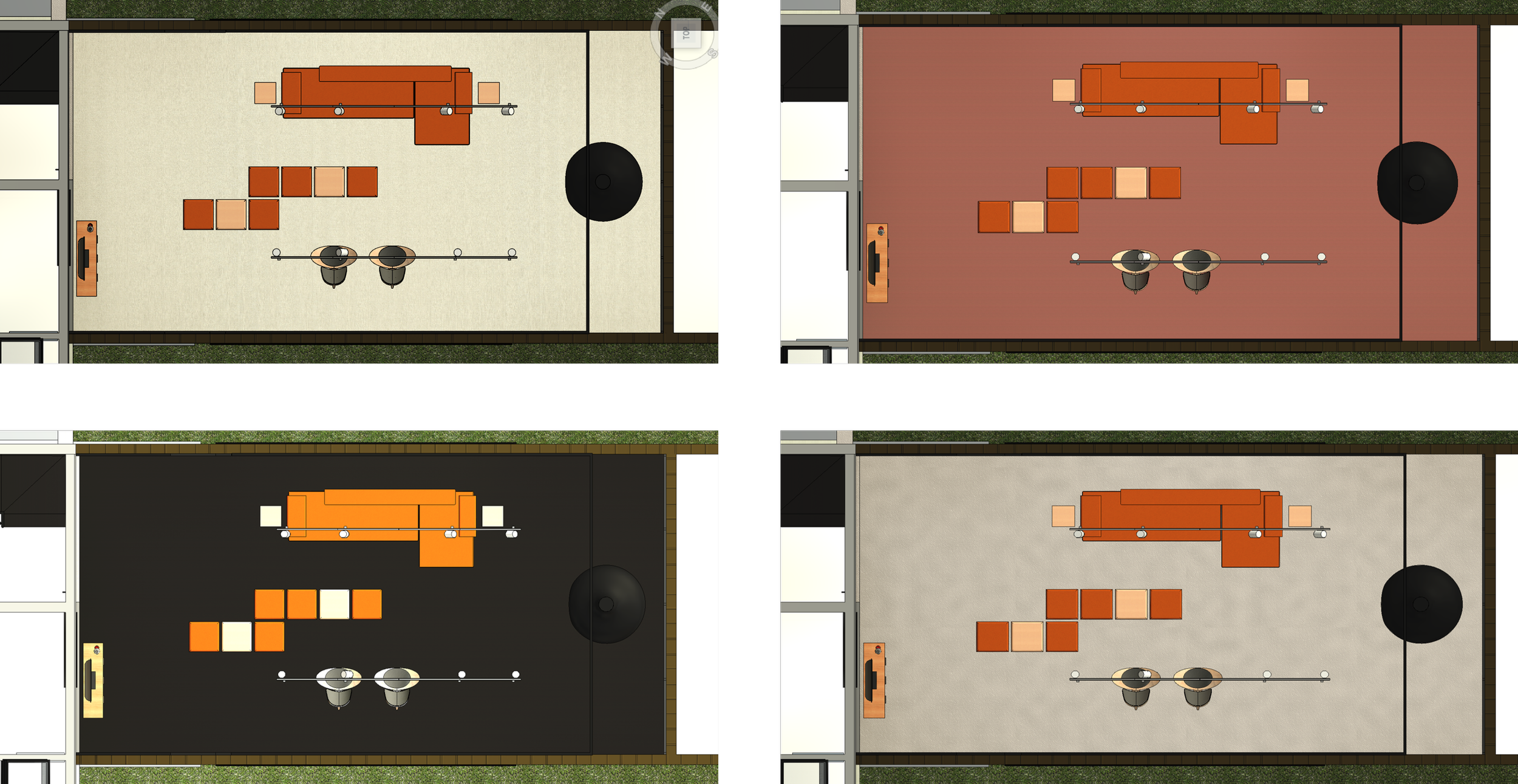 A basic 2D Interior Design, with colour and components included. Material choice and component layout were changed by the client after seeing the original design, each material change shown above.