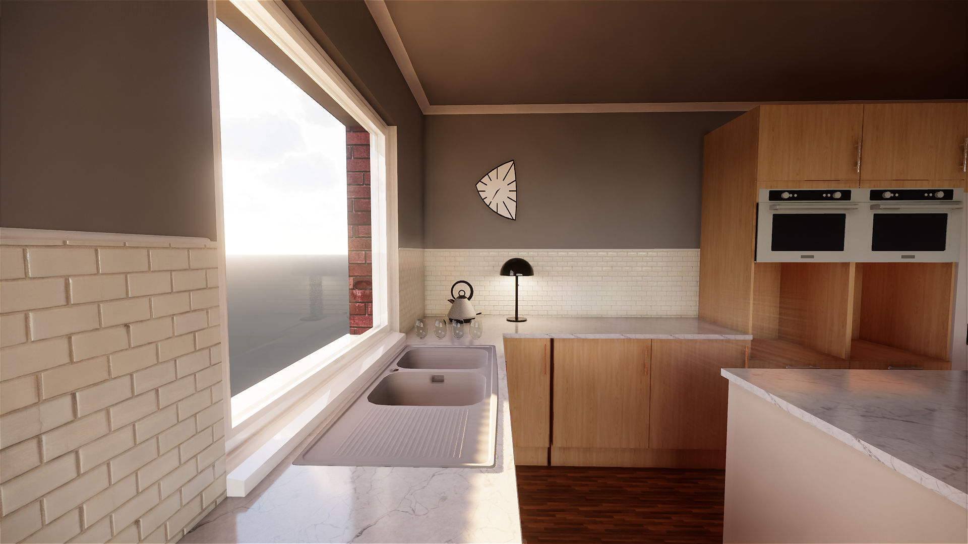 A Rendered 3D Interior Design, with colour and components included. Client wanted to understand how their marble worktop would look with a wooden design.